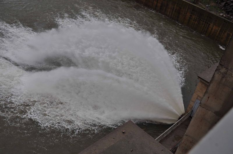 En la foto vemos el grandioso chorro de agua continuo para desembalsar la gran cantidad de liquido que le entra.