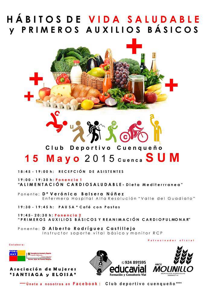 El Club Deportivo Cuenqueño, dentro de sus actividades de promoción y disfrute del deporte, realiza una nueva actividad en la aldea de Cuenca, esta vez orientada a informar a todos los asistentes sobre conocimientos básicos de primeros auxilios, así como nociones sobre alimentación cardiosaludable y dieta mediterránea. En esta ocasión, contaremos con la colaboración del Hospital de Alta Resolución "Valle del Guadiato" para la impartición de una de las ponencias, así como de la "Asociación de Mujeres Santiaga y Eloisa" de Cuenca que participará en la organización y desarrollo del evento. Con fecha de 15 de mayo de 2015, a las 18:45 h. de la tarde en el Salón de Usos Múltiples de Cuenca, todas aquellas personas interesadas están invitadas a la asistencia de la jornada, en la cual se podrá disfrutar de un café con pastas así como conocer el club deportivo y sus propuestas de actividades para este 2015.