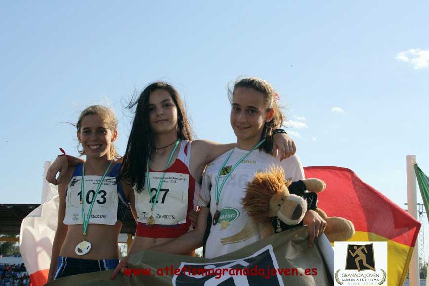 Cristina Morera Duque competía en Lanzamiento de Peso (3 kg) partiendo con la 3ª mejor marca del Ranking Andaluz (9.13 metros), ya en el primer lanzamiento nos ilusionó a todos, en su línea, siempre creciéndose, sacó un zambombazo de 9.28 metros. Con ese primer lanzamiento tenía la plata, ninguna la superaba en ese momento, hasta que Alba Martínez, 1ª del Ranking sacó un lanzamiento demoledor de 11,36 metros. En la 2ª ronda, Ana María Carmona (2ª del Ranking) alcanzó a Cristina por tan sólo 3 cm. la superó (9.31 m). Buena competición la de Cristina en Peso, que alcanzó finalmente la Medalla de Bronce superándose con Mejor Marca Personal.