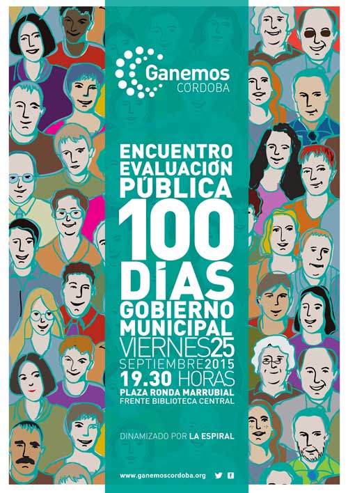 Ganemos Córdoba realizará un encuentro, abierto y dinamizado, con sus adscritos y simpatizantes para evaluar conjuntamente su labor en estos primeros 100 días en el ayuntamiento. El evento tendrá lugar en la plaza frente a la Biblioteca Central de Córdoba, en la C/ Ronda Marrubial s/n, mañana Viernes 25 de septiembre de 19.30 a 21.15 horas. El acto tendrá el siguiente desarrollo: