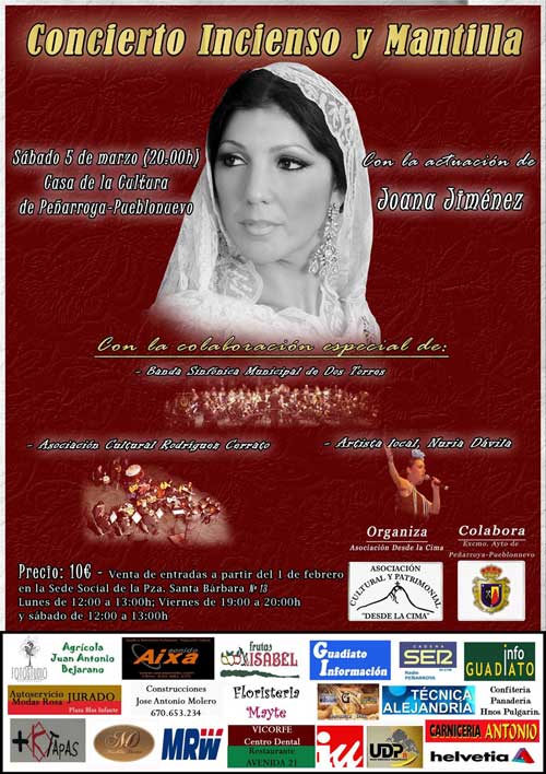 Basándonos en concebir el patrimonio no solo en lo constituido por aquellos objetos del pasado que cuentan con un reconocimiento oficial, sino por todo aquello que nos remite a nuestra identidad y a la conservación de nuestras tradiciones tenemos el placer de informarles de la celebración el próximo Sábado5de Marzo (20.00h) en la Casa de la Cultura de Peñarroya Pueblonuevo, de la V edición del concierto Cofrade Desde la Cima una efeméride que queremos celebrar con el espectáculo Incienso y Mantilla.