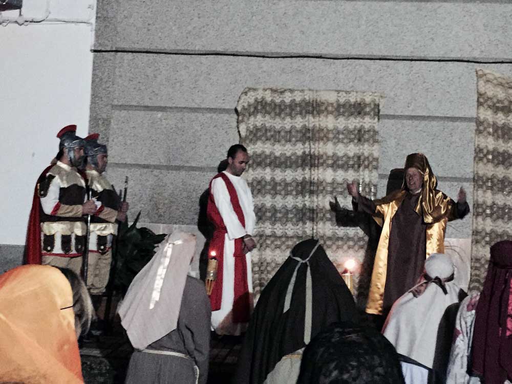 Los vecinos escenificaron las 14 estaciones, “El bofetón de la Guardia de Anás”, “El ahorcamiento de Judas”, “Jesús en la última cena”, “En el Huerto de los olivos” “Judas lo traiciona y es arrestado”, “Negado por Pedro”, “Condenado por el Sanedrín”, “Juzgado por Pilatos”, “Flagelado y coronado de espinas”, “Cargando con la cruz camino del calvario”, “Ayudado por el cirineo a llevar la cruz”, “Encuentra a la mujeres de Jerusalén”, “Llega al calvario y es crucificado”, “En la cruz junto a su madre”, “Muerte de Jesús”, “Colocado en el Sepulcro” y “Resucitado de Jesús”.