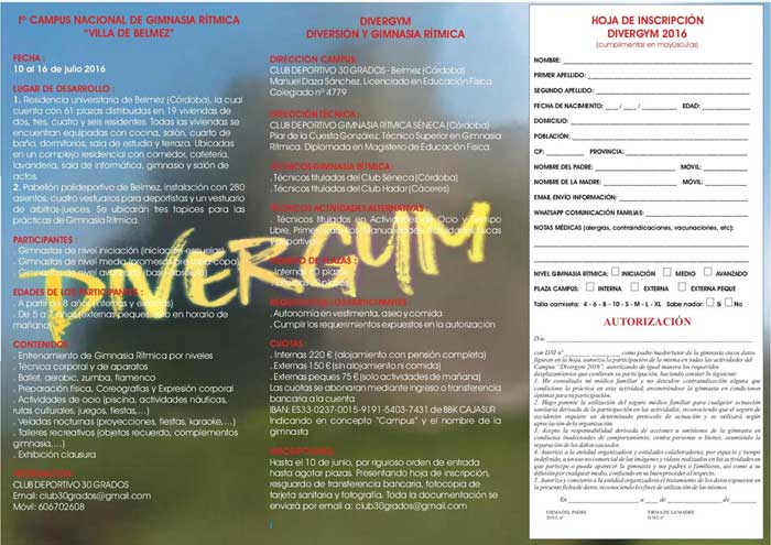 La Gimnasia Rítmica tendrá un nuevo evento de referencia en Andalucía, el CAMPUS NACIONAL DIVERGYM. La conjunción de voluntades del Club Deportivo 30 Grados y del Club Deportivo Gimnasia Rítmica Séneca (Córdoba), con la colaboración del Excmo. Ayuntamiento de Belmez y la Diputación Provincial de Córdoba, han dado como resultado una propuesta de campamento de verano que unirá Diversión y Gimnasia Rítmica. El Campus, de ámbito nacional, se celebrará en el complejo residencial universitario de la Villa de Belmez (Córdoba) del 10 al 16 de julio y contará con técnicos de reconocido prestigio del Club Deportivo Séneca y del Club Deportivo Hadar (Cáceres). Todo se ha planificado buscando la excelencia, alojamientos, comidas, técnicos, instalaciones, actividades, etc, un compendio de detalles que hacen de este campamento de Gimnasia Rítmica algo completamente diferente, y todo ello a un precio inmejorable. En DIVERGYM las estrellas invitadas serán las propias participantes. Asegura tu plaza en esta aventura gimnástica.