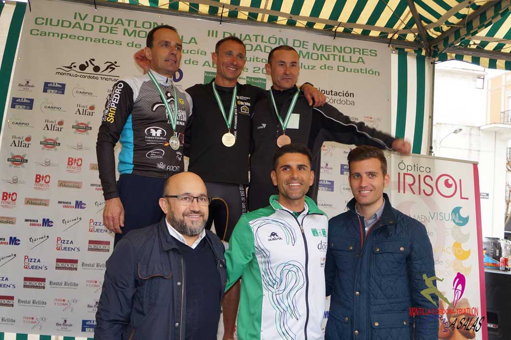 Antonio realizó una gran competición manteniendo una gran lucha en todo momento por los 3 primeros lugares. Hizo unos parciales en las dos partes de carrera a pie que le hubiesen valido la Medalla de Oro. Cuajó un crono de 17:23 en los primeros 5.000 metros (el mejor de su categoría), en la llegada a la transición de bicicleta marchaba 1º de su grupo de Edad (50-54 años) teniendo en su poder la Presea Dorada contando con una ventaja de 18” respecto al segundo clasificado en ese momento; aunque durante la prueba de Ciclismo se vio rebasado por varios duatletas de su categoría aunque siempre manteniendo la pugna; en una dura rampa de subida se quedó a cola de grupo viéndose perjudicado al descolgarse algunos ciclistas y abriéndose un hueco insalvable de algunos segundos; incluso tuvo que pelear por no quedar 4º, con todos estos ingredientes, marcó el 4º mejor parcial con la bicicleta empleando un tiempo de 36:35 en los 20 kilómetros; rápidamente sacó la casta que caracteriza a Bernardino y además de recuperar la 3ª posición recortó con creces la distancia perdida con la bicicleta hasta quedar a 13” del que fuese Medalla de Plata, no en vano se anotó de nuevo el mejor parcial en la carrera de 2.500 metros hasta la Meta con un crono de 8:59, empleando un tiempo total de 1h2:57, para finalizar con esa merecida Medalla de Bronce de Andalucía (109º de la general). Antonio Jiménez Casado (C.A. Lucena) fue Sub-Campeón con 1h2:44 y se proclamó Campeón de Andalucía de Duatlón Miguel García Rubiño (C.D. Olimpo Dr. Bike Granada) con un tiempo de 1h1:24. Podium de la Categoría de Edad de 50-54 años que contó con un total de 18 participantes.