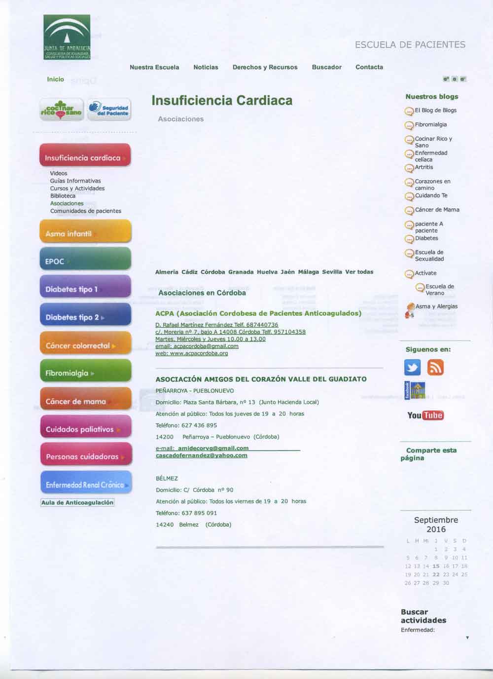 Destacar como novedoso el reconocimiento de la Asociación Amigos del Corazón Valle del Guadiato, por la Escuela de Paciente. La asociación tiene sede en Peñarroya y Belmez, el domicilio, horario, teléfono y correo de contacto se encuentra en la página web anteriormente citada para quien lo necesite. No nos podemos olvidar, que los profesionales tenemos la oportunidad de conocer la enfermedad desde el punto de vista de la experiencia personal de las personas que la padecen, ya que a la Escuela se acude a contar, escuchar y aprender.