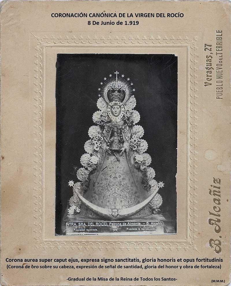 ─ La foto oficial de la Coronación de la Virgen del Rocío, el 8 de Junio de 1919, salió de Pueblonuevo del Terrible, hoy Peñarroya Pueblonuevo (Córdoba), en palabras de D. Francisco de la Corte Jiménez (Corresponsal en Pueblonuevo del Terrible, presidente de la Sociedad Álvarez Quintero y representante de la Sociedad de Autores Españoles), y según consta en la publicación madrileña “El Fígaro”, con fecha de 31 de Mayo de 1919:
