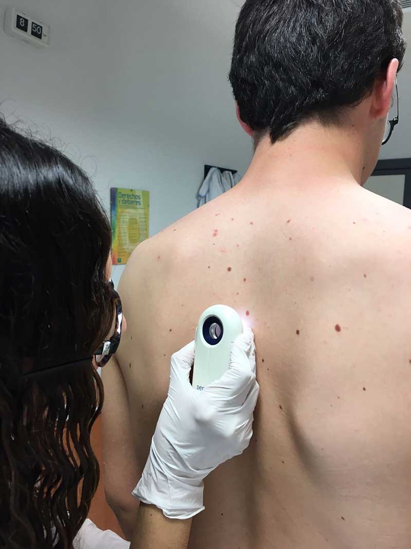 Esta actividad consiste en ofrecer a la población de manera gratuita la posibilidad de revisarse la piel, en busca de lesiones sospechosas de cáncer de piel. No en vano, cada vez se diagnostican tumores de menor tamaño gracias a determinadas técnicas como la dermatoscopia, que consiste en un dispositivo con lente de aumento y luz polarizada, que permite ver estructuras que no son evidentes.