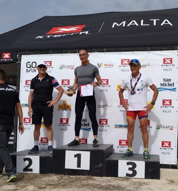 Sobre una distancia de 1500 de natación, 30 kms., de mountanbike y 10 km de carrera a pie, por los alrededores y acantilados de Golden Bay, ( isla de Malta), con un tiempo de 3:24:55