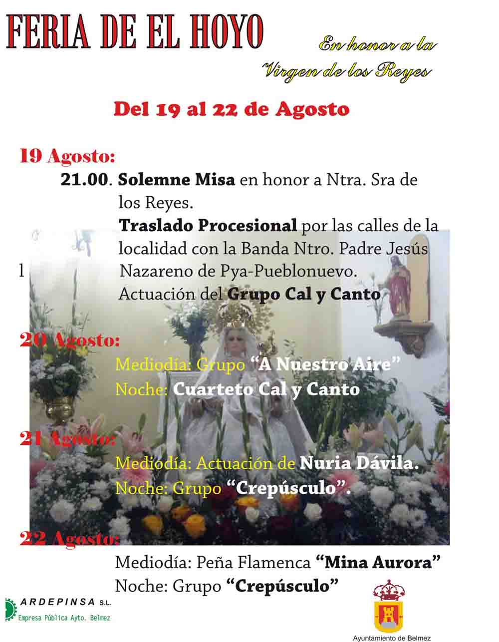 En esta pedanía belmezana el mismo jueves se celebró la solemne misa y posterior procesión en honor a su Patrona, la Virgen de los Reyes, dando así comienzo la feria y fiestas de la pedanía de El Hoyo de Belmez, que durarán hasta el domingo 22. Serán días de fiesta y actuaciones en la Caseta Municipal en los que amigos y familiares se reencontrarán y disfrutarán de estos días. Lechón, Bacalao, Berenjenas en vinagre y demás especialidades de la zona harán las delicias de visitantes y hosteleros.