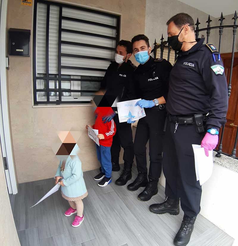 Sres. Agentes, FELICIDADES por el gesto, muy buena idea de llevar ilusión y alegría a los más pequeños, pero CRÍTICA POR LA FORMA de cómo apoyan sus manos en los niños, creo que deberían mantener una distancia y mucho menos apoyar sus manos en ellos, como aparece en la foto.