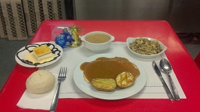 Para Nochevieja la mesa también se viste de gala. Se degustarán: ensalada de marisco con salsa rosa, Vichysoisse con virutas de jamón y medallones de merluza con gambas y mejillones sobre lecho de pisto, y de postre tarta de tiramisú, así como las tradicionales uvas de la suerte. El almuerzo de Año Nuevo se compondrá de jamón serrano y queso manchego, crema de marisco, carrillada de cerdo al vino tinto con patatas panaderas y natillas caseras y surtido de dulces navideños.