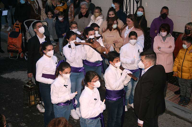 Tras ella se formó el cortejo procesional formado por niños y niñas vestidos de nazareno sin capirote y mantilla delante de la imagen del Stmo. Cristo del Perdón, que en esta ocasión la llevaban al brazo de tres portadores muy jóvenes, de un total de trece que fueron dando relevos, incluidos tres más que portaban las pértigas para sujetar la imagen en los descansos.