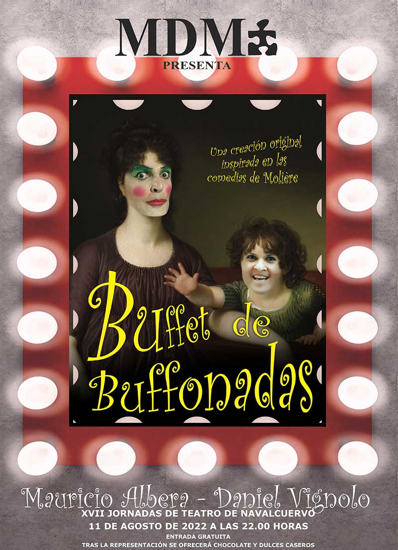 Desde la Asociación de Vecinos y Amigos Nuestra Señora de la Piedad de NAVALCUERVO les invitamos a esta representación teatral gratuita, nocturna y al aire libre de BUFFET DE BUFFONADAS, a cargo de la compañía MD Producciones con una puesta en escena de comedias de Molière. Posteriormente habrá invitación a chocolate y dulces caseros.
