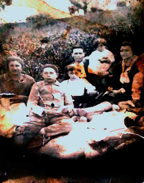 De izquierda a derecha vemos a: Antonia Sedano Mellado, bisabuela de Marí Carmen Rubio, a su lado el repartidor de los periódicos, que no sabe su nombre, vemos también a sus abuelos, Gregorio Miranda Fernández y Florentina García Sedano, primeros propietarios del kiosco y a sus tíos y madre, Antonio, Francisco y María Miranda García a la que vemos en medio de sus padres.