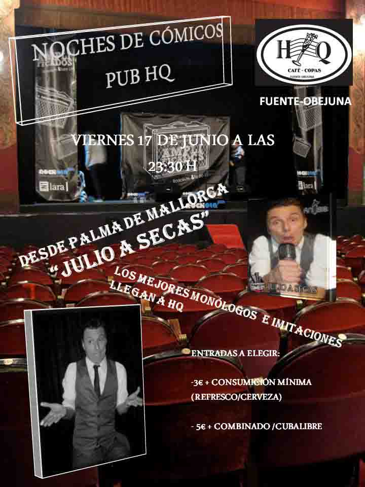 El próximo viernes 17 de Junio a partir de las 23,30 h podremos disfrutar en Pub. "HQ" de la actuación del mallorquín Julio a Secas, conocido por la cadena televisiva Paramount Comedy, especialista en hacer reír con sus monólogos e imitaciones.