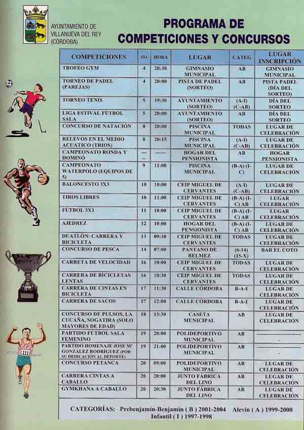 La mayoría de las poblaciones de nuestro entorno celebran en verano su Feria y Fiestas en honor a su patrona o patrón. En ellas se invierte tiempo y dinero para que tanto los residentes del municipio como los visitantes eventuales tengan una buena impresión del municipio, se les deje un buen sabor de boca, y su estancia sea de lo más gratificante. Para ello se toman iniciativas en cuanto a actuaciones musicales para jóvenes y adultos, entretenimientos tipo magos y payasos para los más pequeños, corridas de toros para los aficionados, degustaciones populares en las casetas, etc. Muchas y variadas actividades que cambian el día a día del municipio. Mucha inversión en cultura y festejos, pero ¿y en deporte?. El deporte es un entretenimiento más con el que podemos llegar a toda la población, la inventiva al respecto nos puede llevar a tener ocupados a los numerosos habitantes eventuales y provocar con ello una mayor satisfacción sobre su estancia. Un ejemplo claro de ello es la localidad de Villanueva del Rey, cuyo programa de festejos se ve complementado por un amplísimo y variado programa deportivo "de competiciones y concursos", con un total de 24 diferentes actividades (y muchas más no anunciadas) con las que llegar a todos los ámbitos de edad y población y ocupar un largo periodo de tiempo. Con muchas de ellas se fomenta la cultura local, a modo de juegos populares y arraigados entre la población.