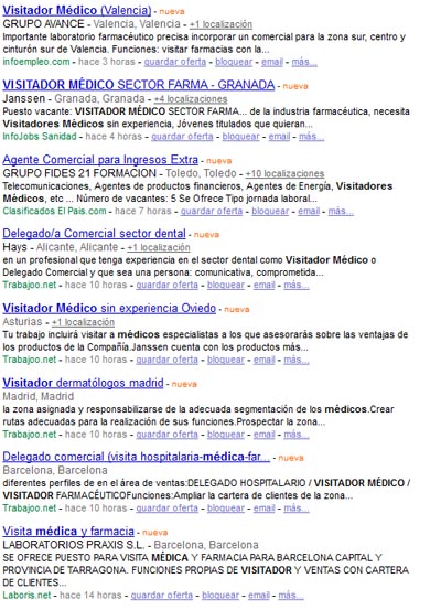 Salen decenas de ofertas al día en España. Esta organización no se da en otros colectivos (por ejemplo, periodistas), y por ello, me sorprende. ¿Es significativo? (http://www.itssevilla.es/, http://itsalicante.com, http://www.its-toledo.com, http://www.itsmurcia.com, http://www.itsgestion.com, http://www.itstenerife.es, http://www.itshuelva.es... Y así en cada provincia). La formación en visitador médico crece, algo que ya ha denunciado Carlos Ponte (congresos de formación, unos eventos que resultan sumamente caros). Pero también, el negocio de los visitadores está autorregulándose, lejos de hiperbólicos lujos y ofrecimientos desmedidos, como sus fuentes describen, aprendiendo de errores del pasado.