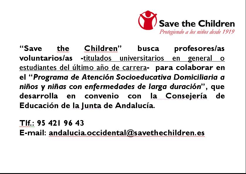Para poder atender a todos los niños enfermos Save the Children busca voluntarios interesados en colaborar con el Programa, preferiblemente Licenciados o Diplomados, o bien estudiantes de últimos cursos que dispongan de 4 horas semanales para acudir a los domicilios de los chicos. El horario y el área geográfica en que se realiza la atención dependen de la disponibilidad del voluntario. Los gastos de desplazamiento y material necesario para la atención educativa son cubiertos por Save the Children.