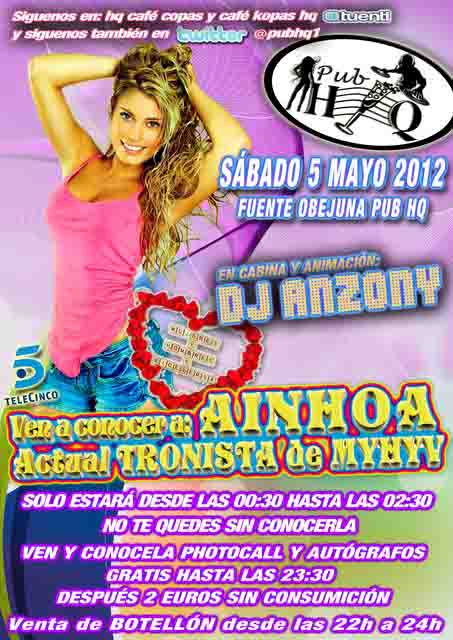 El próximo sábado 5 de Mayo podrás conocer a la actual tronista de MYHYV, a la guapísima Ainhoa, en Pub "HQ" de Fuente Obejuna. Sólo estará en el local desde las 00,30 h hasta las 02,30 h, durante estas dos horas podrás conocerla, hacer photocall y recibir autógrafos de la popular personaje televisiva del programa de Tele 5. En cabina y animación estará D.J. Anzony. Hasta las 23,30 h podrás acceder al pub gratuitamente, y a partir de esta hora la entrada será de 2 euros sin consumición. Habrá además venta de botellón desde las 22,00 h hasta los 24,00 h
