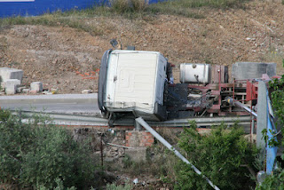 En la tarde del jueves día 24, se produjo un espectacular vuelco de un camión cuando participaba en las labores de mejora del firme de la rotonda del Pilar del Matadero. A pesar de lo aparatoso del suceso no hubo que lamentar nada más que daños materiales.