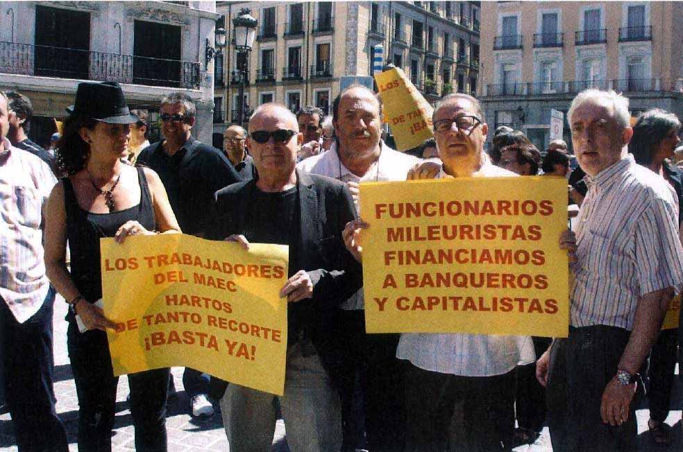 Sólo haré un gran matiz: FUNCIONARIOS, no os quejéis de vuestra situación. Al menos tenéis un puesto de trabajo, que por desgracia es intocable, digo por desgracia porque muchos sois bastante incompetentes. Además no hacéis prácticamente nada la mayoría, salvo honrosas excepciones que terminan sufriendo de estrés por culpa de los incompetentes. DEBERÍAS PERDER VUESTRO PUESTO DE TRABAJO IGUAL QUE CUALQUIER OTRO EMPLEADO. Si os han recortado un 5% no os quejéis, a otros trabajadores también les han recortado. Pensad en todos los trabajadores que no son ni 1000euristas, como mostráis en la pancarta. Yo personalmente he tenido sueldos alrededor de 800 - 900 euros y soy afortunado. Ahora ya me sumo a la moda, PARADO!! Entonces, ¿De qué os quejáis? Lo siento, pero aún os pueden recortar un poco más y no pasa nada. Que no sois los únicos de los que echan mano los POLÍTICOS INCOMPETENTES para sanear Bankia.