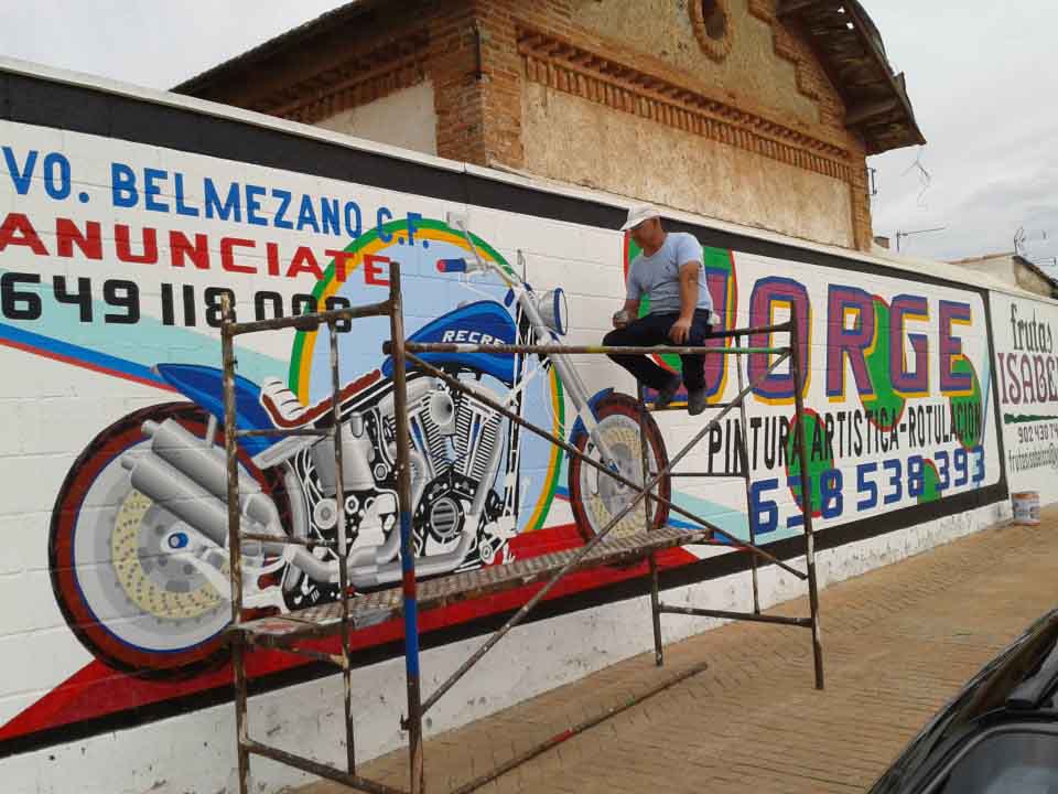 Hoy traigo a un belmezano, que en su trabajo demuestra cada día su gran profesionalidad, su buen hacer, esos pinceles y esa forma de tratar el contenido de su obra, es sencillamente magistral, el combinado de los colores y la, perfección se muestra en su trabajo, JORGE, es un maestro en la rotulación, sobrino del aquél mítico portero del RECRE en sus tiempos, el añorado MORGAN. q.e.p.d., una persona que fue muy querida por ambos pueblos, Jorge, disfruta con su trabajo, pero ahí con esos pinceles se le nota su formación de dibujo lineal y plasma esos grandes trabajos de una forma sensacional, ha hecho un trabajo junto al campo de fútbol de Belmez, que nos ha dejado con la boca abierta, esa moto, es una verdadera delicia, como la ha tratado, combinando, piezas y colores fantásticos y ha tenido esa delicadeza en el depósito de la gasolina o diesel, poner el nombre en azul de ese equipo que él quiere su Recre.