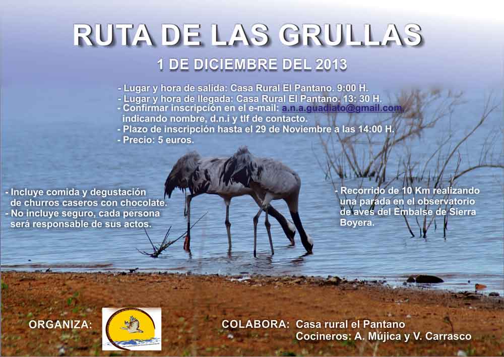 Salida de la casa rural el Pantano en termino de Pya-Pvo junto al pantano a las 9:00 desayuno chocolate con churros y a las 10:00 comiezo de ruta por los arrededores del pantano hasta las 13:00 regreso y comida. Inscripciones en el correo a.n.a.guadiato@gmail.com o al TF 647000381 pazo limite hasta 29-11-13 a las 14horas. Organiza Asociación Naturalista Alto Guadiato y colaboran : Casa Rural El Pantano, A.Mújica y V.Carrasco.
