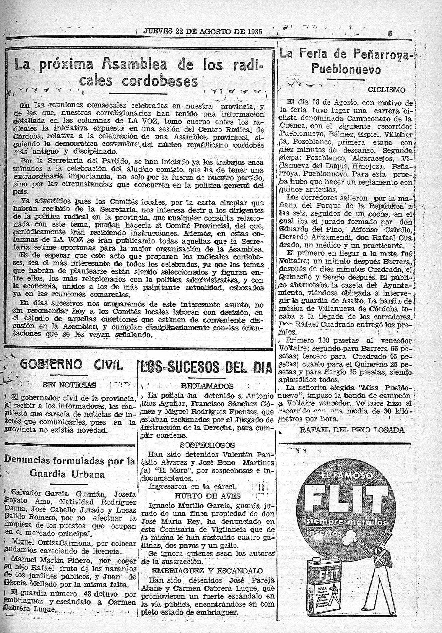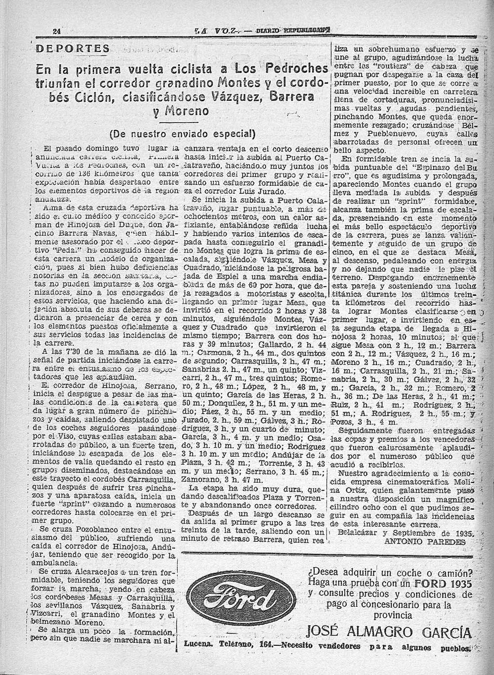 1935 En la feria de agosto de Pueblonuevo se organizo una carrera ciclista, la cual se denomino “Campeonato de la Cuenca”con el siguiente recorrido: Primera etapa; Pueblonuevo, Belmez, Espiel, Villaharta, Pozoblanco con diez minutos de descanso en dicha ciudad. Segunda etapa; Pozoblanco, Alcaracejos, Villanueva del Duque, Hinojosa, Peñarroya-Pueblonuevo.
