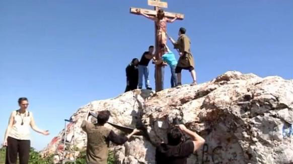 Valentín Moyano, director de este trabajo, eligió el Peñón de Peñarroya-Pueblonuevo para escenificar la Crucifixión, trabajo en el que llegaron a emplear hasta 14 horas. Hasta el lugar, trasladaron una pesada cruz de madera que cuenta con unas dimensiones de cuatro metros y medio de alto y dos de ancho, y que ahora se expone a las puertas del palacio de la Merced.