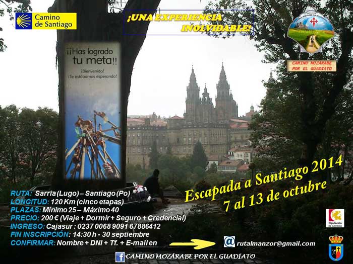 Como siempre será en octubre, concretamente entre el 7, martes de ida y el 13, lunes de vuelta. Este año y dado que el día 12 es fiesta en gran parte de las comunidades autónomas, se aprovechará para pasar el domingo 12 en Santiago de Compostela de visita cultural. Ya el lunes día 13, se realizará el viaje de vuelta a casa. En definitiva, el martes día 7, de madrugada, sobre las 05:00 h, se partirá hacia Sarria en Lugo y a partir del miércoles 8 se empezarán a cubrir en cinco etapas, 120 Km en total, el recorrido hasta el domingo 12, en que se llegará a Santiago. Asistencia a la Santa Misa en la Catedral con el Botafumeiro y después de almorzar visita a la ciudad. La finalización de las inscripciones será el 30 de septiembre a las 14:30 h. El precio de viaje de ida y vuelta + el seguro + dormir en albergues y la Credencial del Peregrino, cuesta 200 €. Son 6 noches y siete días de escapada y acompañará el bus para aquellos que no puedan cargar mucho peso.