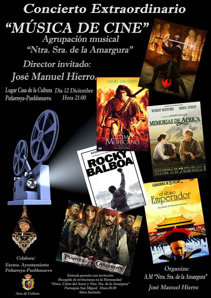 En este concierto podremos escuchar a la agrupación musical interpretando bandas sonoras de películas muy conocidas como Roky, El último Mohicano… etc. Como bien es sabida por todos los lectores nuestra Agrupación está centrada en los que los cofrades llamamos, eso, música cofrade. Pero esta vez no ha podido resistirse a la idea de Don José Manuel Hierro, cuando al finalizar Semana santa nos propone esta idea tan original a modo de concierto Extraordinario. Dicho y hecho a principios del verano D. José Manuel Hierro se pone manos a la obra realizando todos los arreglos y composiciones de todas las B.S.O necesarias para la agrupación y los componentes de la Agrupación da comienzos a los ensayos de esta nuevo estilo música, pero que como MUSICOS que son lo interpretan magníficamente, pues antes del estreno ya nos han llegado ofertas de otros lugares para su interpretación.